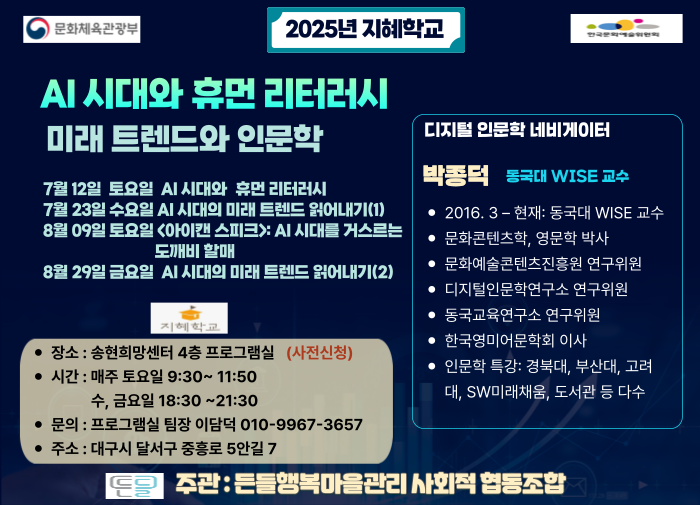 이 프로그램은 코딩과 같은 전문기술을 가르치는 것이 아니라, 현실 속에 내재한 기술을 쉽게 삶에 접목함으로써 생활을 윤택하게 할 수 있는 기술의 활용을 소개한다. 아울러 AI 시대에 잊혀지기 쉬운 본질적인 인간의 주체성(실존적 생의 의미, 인문학적 통찰)을 다시 고찰할 수 있는 기회를 제공함으로써 참여자들의 각자의 삶에 본 프로그램을 통해 AI 시대에 대한 이해력을 증진시키면서도 동시에 인문학적 통찰을 통해 삶을 관조하는 주체적인 시각을 갖게 될 것이다. 강사는 2016년부터 동국대(WISE) 교양융합교육원(외국어교육부/글로컬인재학부)에서 전임교원으로 재직하고 있는 교수이다. 영문학박사를 취득한 후 문화콘텐츠학 박사과정을 수료하였으며, 동국대(WISE)에서 영문학개론, 영상문화콘테츠이해, 포스트네트워크시대 텔레비전드라마 등과 같은 인문학 융복합 강의를 해오고 있다. 경주, 세종시 인문도시 사업단 시민 인문강좌, 달성군립도서관, 부산대, 수성구 미래재단 등에서 다양한 인문학 강좌를 해왔기 때문에 중장년층 및 노년층에게 유요한 인문학적 통찰을 제공할 것으로 기대된다.