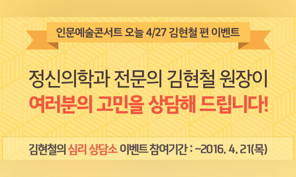 인문예술콘서트 오늘 4/27 김현철 편 이벤트 김현철의 심리상담소 <세상을 여행하는 초심자를 위한 안내서>, <나는 늘 잘해야 한다고 생각한다>의 저자 <무한도전>, FM <별이 빛나는 밤에>, <두시의 데이트> 등 출연 정신의학과 전문의 김현철 원장이 여러분의 고민을 상담해 드립니다.