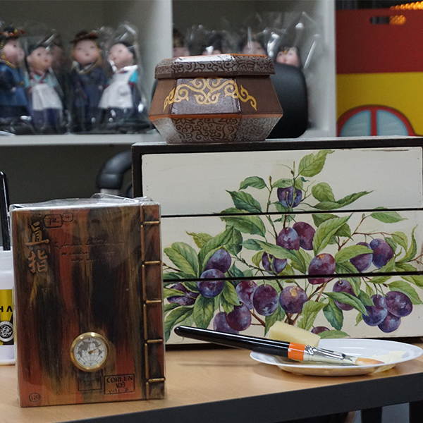 작업실 곳곳에 있는 다양한 생활소품 역시 이신재 명인의 손길을 거친 작품들이다. 원하는 색감의 한지 위에 자신이 좋아하는 그림이나 패턴을 프린트하거나 그린 후 오려서 작품에 붙이는 데코파쥬 기업을 활용했다. 작업실 한편에는 아름다운 꽃무늬가 프린트된 한지를 활용한 시계가 작업 중이다. 주변에 고마운 사람들에게 선물할 예정이라는 이 작품에는 한지의 은은한 색채와 유화물감의 이질적인 화합으로 또 다른 새로움을 보여준다. 프린트 된 종이의 거친 질감도 멋에 한 몫을 더했다.