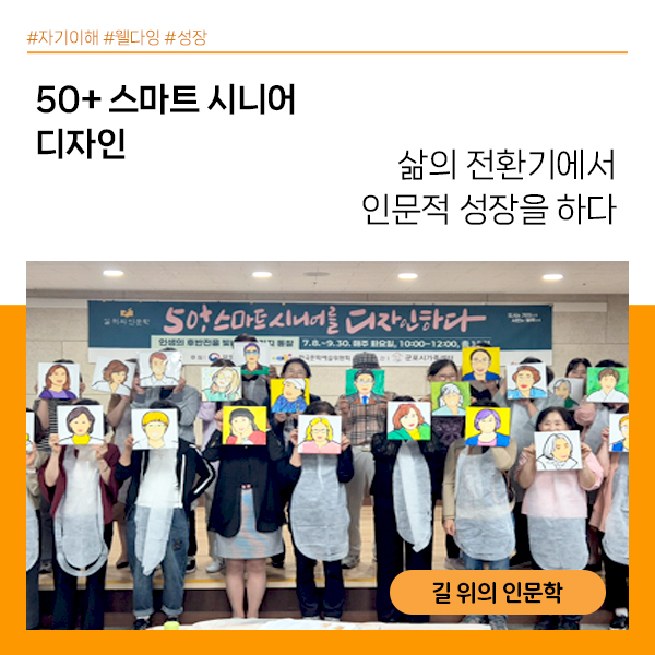 「길 위의 인문학 – 50+ 스마트시니어를 디자인하다」는 중·장년층을 대상으로 자기이해, 관계, 소통, 웰다잉, 죽음 등을 통합한 인문학프로그램입니다.