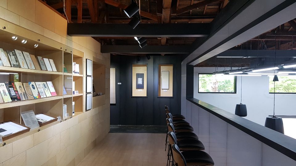 ▲2층 기념공간. 시인의 육성을 들을 수 있는 오디오와 책장. 오른쪽에 보이는 1층 강의실 ⓒ김지원
