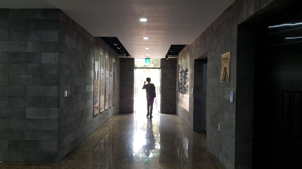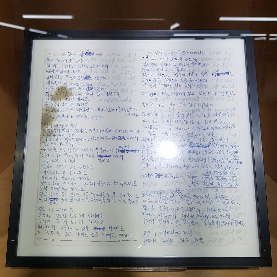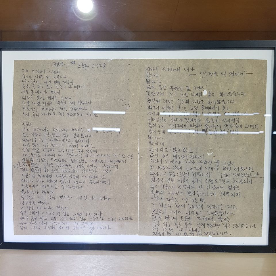 들어가기 전과는 뭔가 달라진 마음으로 기념홀을 나온다. 서늘하고 어둑한 복도를 학생들이 바쁘게 오간다. 기말고사 시험기간이란다. 그중 한 학생에게 김남주 시인과 기념홀에 대해 아느냐고 물었더니 기념홀에 대해서만 안다고 대답한다. ‘함께 가자 우리 이 길을’ 이라는 노래를 작사한 시인이라고 말해주자 “아~!”하고 고개를 끄덕인다.
