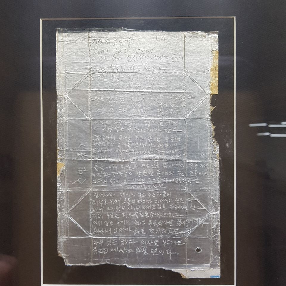 ▲육필원고, 화장지에 쓴 시, 은박지에 쓴 시 ⓒ김지원